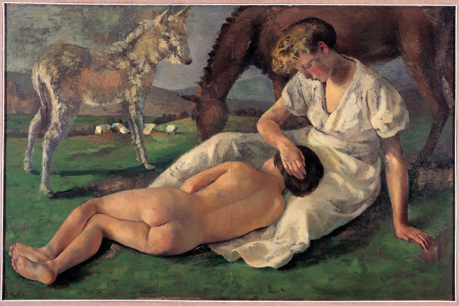 No primeiro termo, á dereita, a nai, sentada, sobre a herba, aloumiña a cabeza do fillo, que se apoia no seu regazo, co corpo espido, tumbado de costas ó espectador; detrás unha égoa e un potriño recórtanse sobre a paisaxe, no fondo da cal se ve unha carreta e unha tenda de campaña. Animais e seres humanos articúlanse nunha bela analoxía, que exalta a unión do home coa natureza, sen efectismos emotivos, creando unha atmosfera de tenrura e poesía arredor das figuras. A cabeza da muller, loira, resalta sobre o fondo escuro do corpo da egua cun lirismo plástico de exquisita sensibilidade.Sobre unha gamma de verdes, grises, marróns e ocres, destacan os brancos e as suaves tonalidades das carnacións.Exposiciones