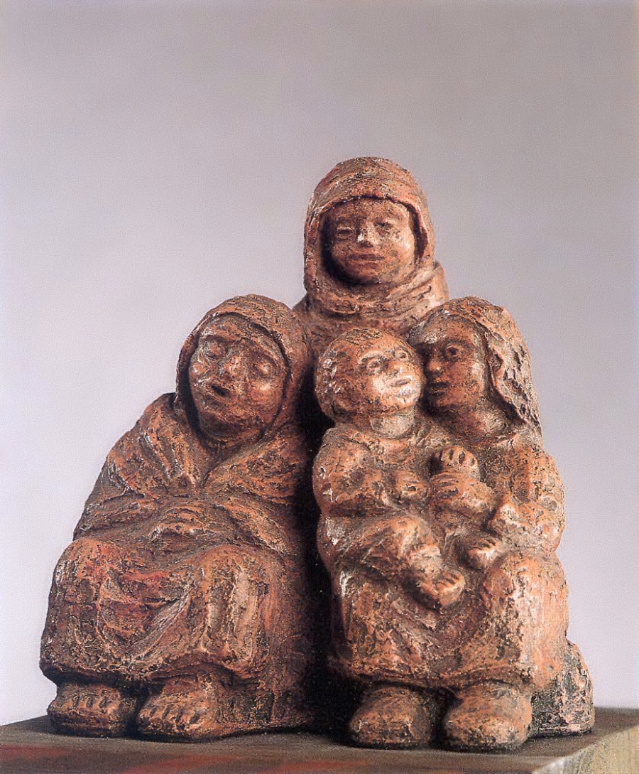 Tres figuras femininas e un neno dispóñense simetricamente, unha de pé e dúas sentadas, co aire dun ritual que se repite cada día. O conxunto escultórico, de pequeno formato, faise meirande, na sensibilidade do que o contempla, robustecido pola tenrura que transmiten as figuras que, cun expresivo silencio transmiten un cálido sentimento de respecto cara aos modos de vida das xentes sinxelas do pobo. O contorno suave dos rostros contrasta cos sucos e asperezas dos vestidos, cunha linguaxe propia, de grande atractivo.