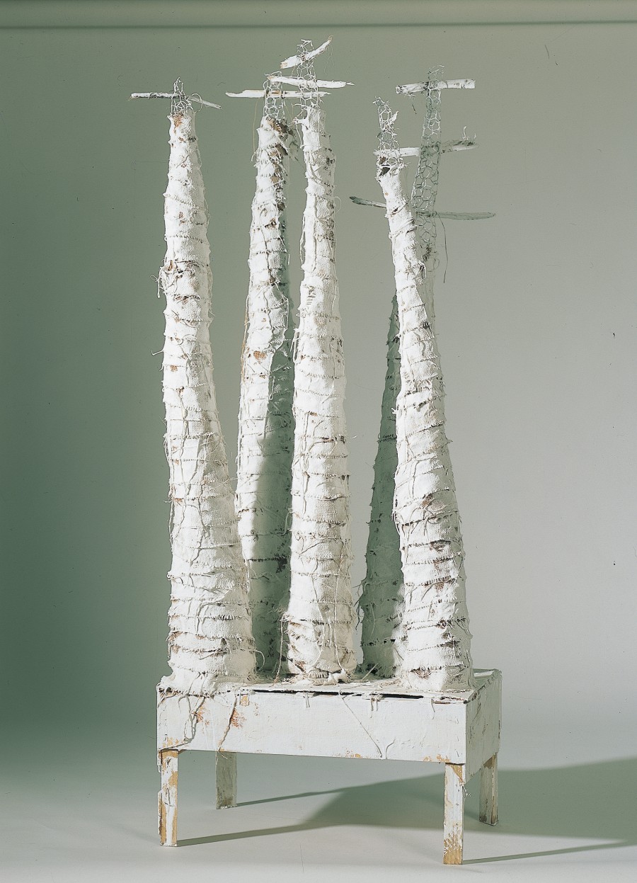 Cun ritmo asimétrico, caprichoso, de acento lúdico preséntase este conxunto de torres cónicas, de formas alabeadas, envoltas individualmente nunha vendaxe que deixa ó aire, en la parte superior, la malla metálica da estructura, material que tanto había utilizado Susana Solano a mediados dos 80. A color, dun blanco calcáreo, extendese a la base de catro patas coa que se apoya no chan creando un ámbito. A combinación de materiais, o espacio que habita entre as formas e dentro de ellas, e a execución manual e espontánea do conxunto, establecen un diálogo plástico no que late o recordo das torres de Gaudí con resonancias de Alberto Sánchez y Christo.Exposiciones